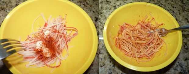 Mezcla la surime con la paprika, semiescabechadas y ajo sal al gusto.