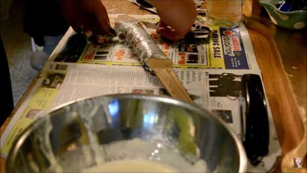 Para hacer la hoja más rígida, papel maché con el harina y 3/4 taza de agua junto con 1 pulgada 1/2 tiras de periódico.