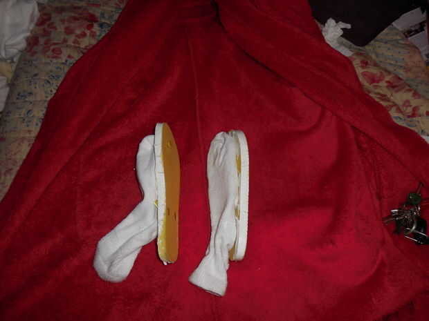 Poner las correas entre los dedos del pie y deslizar en calcetines. Marca fueron hacer agujeros para apretar correa en, ahora cortar pequeña ranura y correa del empuje a través de ella y vuelva a colocar la correa al alma.