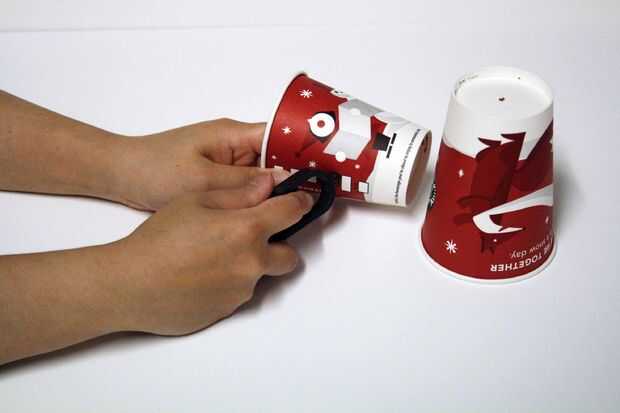 Utilice el punto extremo de la Sierra de segura de Makedo y hacer un agujero en la parte superior de la taza de café más grande. También golpe en el lado de la taza del samller.