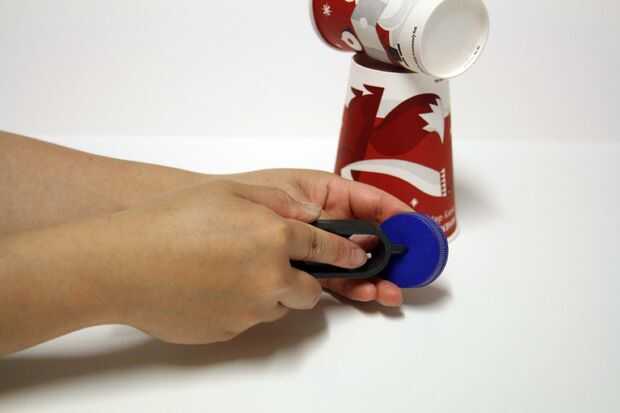 Hacer un agujero en el centro de la tapa de la botella utilizando la Sierra de segura de Makedo. Introduzca un pin de Makedo en el agujero.