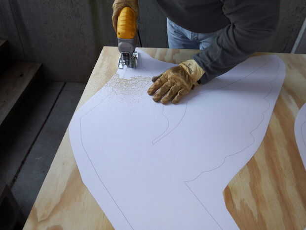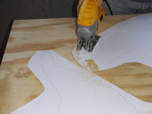 Una vez tienes las plantillas de trazada, ásperas cortar el papel fuera de las líneas y utilizar el adhesivo en aerosol para pegarlas a la madera contrachapada, como se muestra en la disposición.