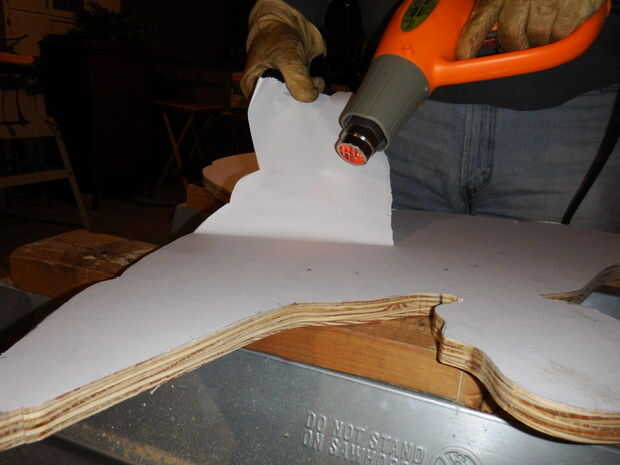 La primera parte de la Asamblea está haciendo el papel de la madera. Para esto, no hay nada mejor que la pistola de calor. Sólo una ola rápida y el pegamento suaviza lo que permite el papel a derecha. Mientras esto sale un poco de una superficie pegajosa detrás, he encontrado que algunas el serrín del paso anterior y frotando sobre la madera se librará de la tachuela.