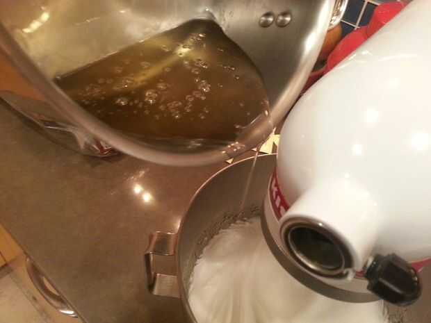 Con su mezclador en medio, rociar lentamente en la mezcla de azúcar. Y cuando digo poco a poco, me refiero a ssssllllloooowwwwwllllllyyyyy. Porque usted está añadiendo este jarabe fundido caliente a claras de huevo crudas, va demasiado rápido te llevará nada más que huevos más asquerosos del mundo.