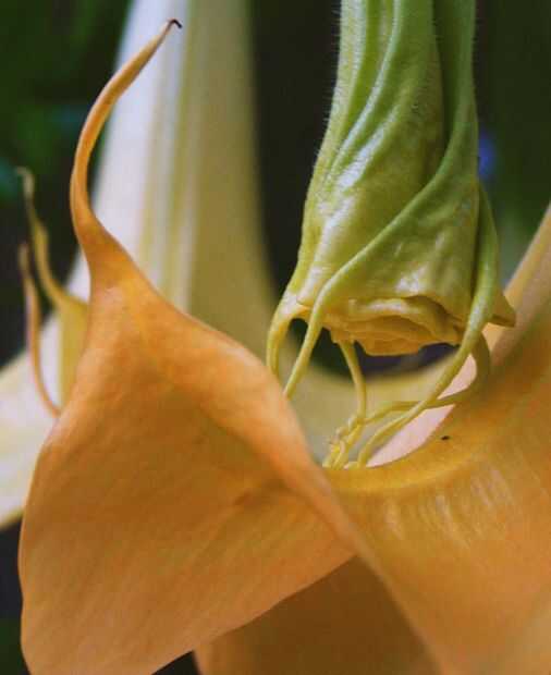 sé que no puedo hacer una flor, pero propagan de una mitad de una hoja y han sido babying lo desde entonces. He tenido que trasplantar cuando nos mudamos casas y he estado cuidándolo desde 2001 cuando tomó una clase de horticultura y había arraigada le. Por supuesto, elegí este Ángel Trumpet, que el maestro dijo es uno de los más difíciles de propagar que pudiese elegir :) Las flores cuelgan boca abajo y son cerca de 5 pulgadas de largo. Los cogollos son brillantes y más aún cuando son todavía muy verde. Parecen extraterrestres... jajaja. Me siento muy orgullosa de todo el trabajo que pongo en esta bella planta pero sabe que realmente no hacerla, porque hay alguien mucho más poderoso que realmente "hecho". La floración de Floripondio en el otoño, así que esta foto fue tomada entonces. Espero que ya que ella necesita atención constante durante el verano, sobre todo este año con esta sequía y ella está haciendo maravillosamente que ella calificará. Si usted necesita una imagen de ella ahora voy a añadir uno, si ella puede calificar a tope que ella es solo deja ahora mismo, quizá algún papá piernas largas porque parecen demasiado la amo...