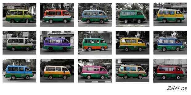 Angkot es la abreviatura de angkutan kota (medios de transporte de la ciudad). Bandung utiliza diferentes colores para coches servicios diferentes rutas. Generalmente consiste en 3 rayas: la base, el cuerpo (color principal) y una pequeña franja para separarlas. Casi todos ellos utilizan el color verde para por lo menos una raya, que representa el lema de la ciudad limpio, dan verde, florido.