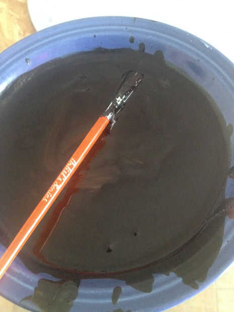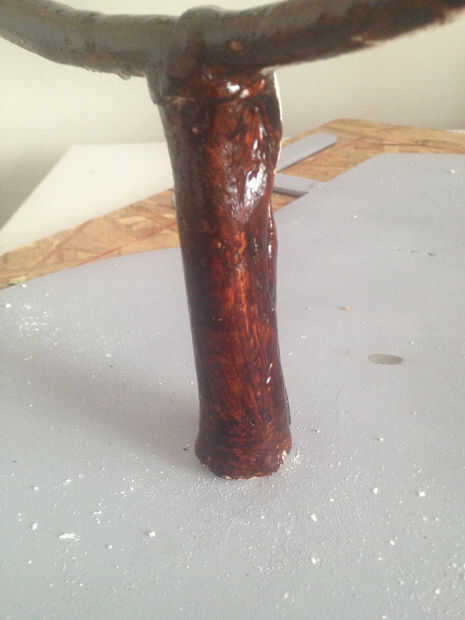 Mientras se enfría el pastel y ganache de espera para alcanzar la consistencia deseada, cubre la estructura de slingshot con fondant marrón/negro. Yo prefiero cubrir con fondant blanco y luego mezcle un par de colorante como amarillo, marrón, negro, rojo, para lograr el color de la madera, que luego pintar sobre el fondant blanco.