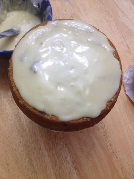 Difundir algunos ganache en el tablero de la torta y coloque el pastel en él. En este momento tienes tu bola completo en forma de pastel