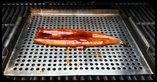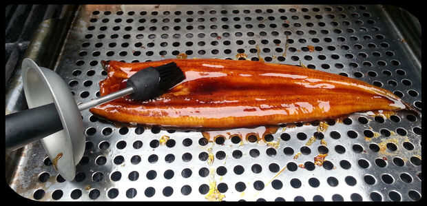 Coloque la descongelado Unagi lomo piel hacia abajo en la cubierta de la parrilla. Parrilla para 3-5 minutos hasta que la piel esté crujiente, bañar la carne una vez con motivo. La manera más fácil a que la piel está crujiente olor - empieza a fragante. Mantener una estrecha vigilancia en el Unagi, se puede quemar fácilmente. Una vez que el lado de la piel esté crujiente, flip y cocinar en lado opuesto, de 3-5 minutos más, una vez hilvanado con sake.