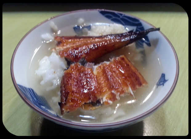 - Coloque el arroz y unagi en tazón de fuente, agregue el caldo dashi y togarashi condimento (mi favorito)
