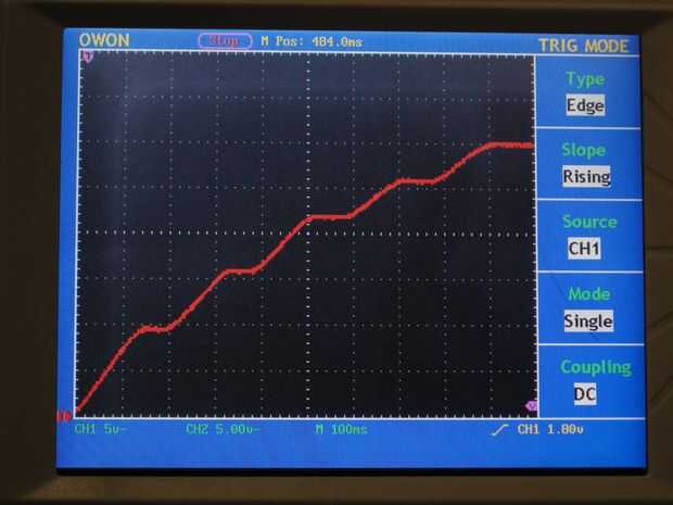 En la foto de osciloscopio a continuación, puedes ver cada vez que el deslizador del carro se movió hacia adelante y hacia atrás, tipo de como rasgueo de una guitarra, se carga el condensador interno un poco mayor. Generalmente se pueden hacer cerca de 1-4 vatios o tan con este tipo de generador y su proporcional a su movimiento, así que pequeños movimientos hacen sonidos más tranquilos inherentemente, no incluso tienes que programar o construir que en el sintetizador!