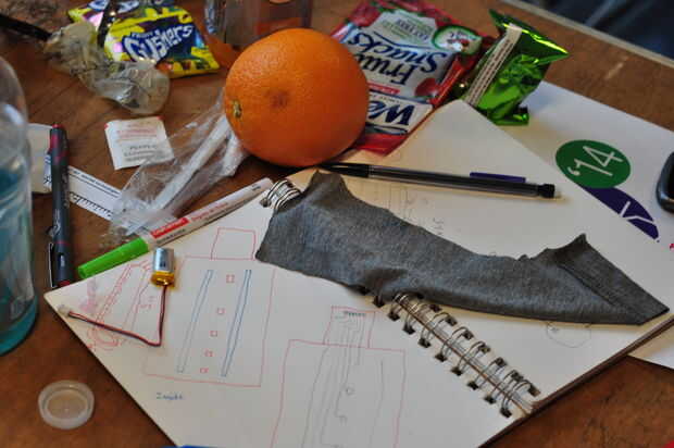 Luego dibujar el circuito en la tela sí mismo. Para ello en el "interior" de la anguila. Nuestro diseño tuvo cinco cables que iban en la parte inferior sensible de la parte del cuerpo. Usted puede desear más o menos o en diferentes áreas. La cosa para recordar es que la sensación realmente viene tanto del electrodo del sí mismo como el camino más corto entre el electrodo y la tierra común.