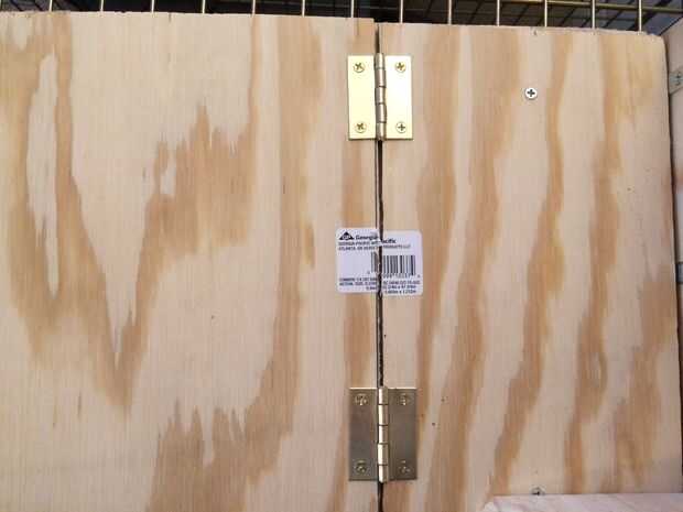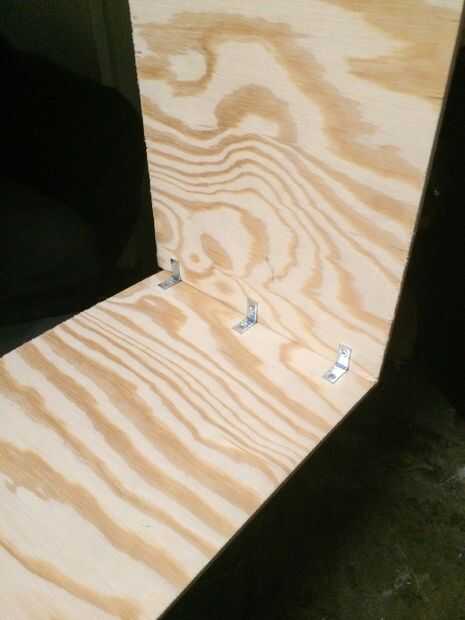 Tomar la pieza media y la pequeña pieza de madera (que deben conectar hacia atrás juntos) y conecte ambas piezas mediante 2 bisagras. Si los tornillos pegan por el otro lado, ajuste con la dremel (o alguna otra herramienta) entonces ellos no pique a nadie.