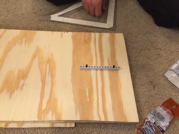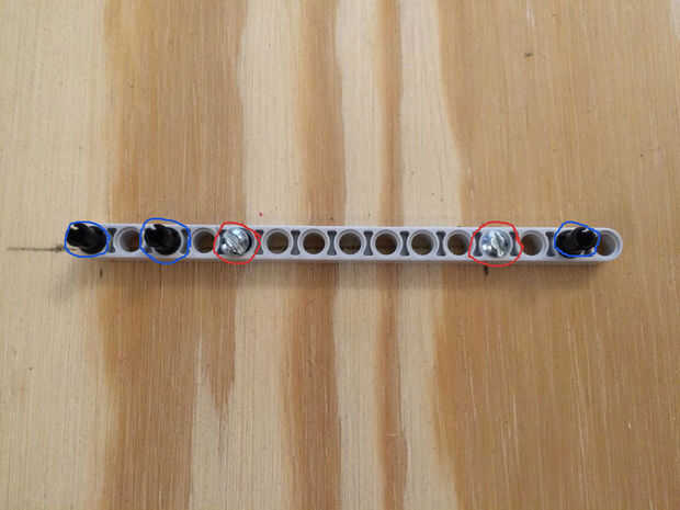 Por último, montar ese rayo de la primera modificación en el medio trozo de madera. Necesita usar los tornillos de madera en los agujeros en un círculo rojo en el cuadro 5. También añadir conectores lego negro en los 3 puntos en un círculo azul en el cuadro 5. Para la colocación de la montura, el cuadro 6 puede ayudar a poner la viga en perspectiva de la madera.