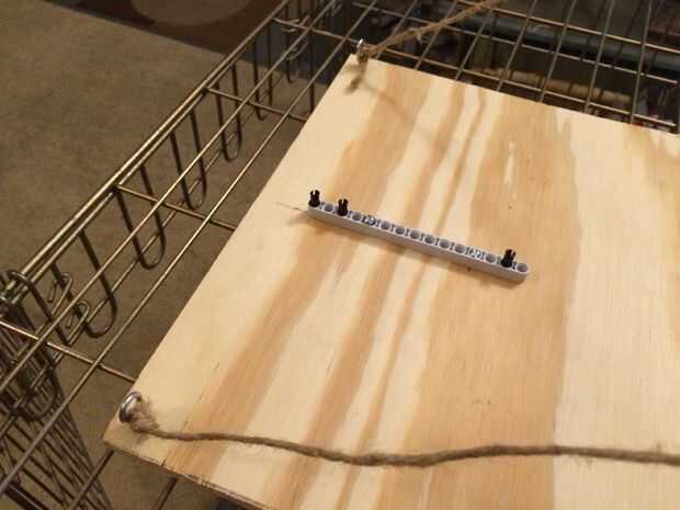 Por último, llevar la cuerda a través de los ganchos de ojo en la espalda (en la parte inferior), hasta y a través de los ganchos de ojo que se encuentran en la parte superior de la madera contrachapada, entonces deben ir todo el camino a los ganchos de ojo por el Monte de lanzador de lego. A continuación, ate la cuerda alrededor de los ganchos de ojo por el lanzador. Luego, cortar la cuerda con un pie y medio de sobra al final. Ver el vídeo incrustado para ayudar con el posicionamiento de la guita.