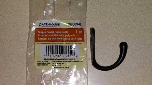 Yo tenía que encontrar una solución rápida y no quería hacer la unidad a nuestro Ikea o a pie de su laberinto de ratón para mi pedazo de queso. En cambio, fui a la ferretería local. Fui la "L" guarde este tiempo. Suelo ir el "H-D", pero la otra está más cerca. Aquí encontré el colgador diente único que demostró para ser perfecta para mis necesidades. La encontré en el pasillo de Hardware a lo largo de los lados bisagras, topes de puerta y otras cosas interesantes.