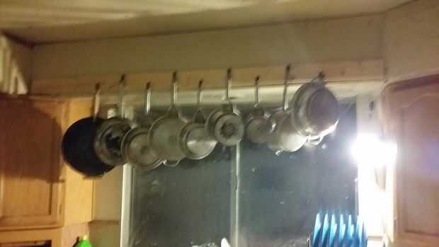 Lo que hace este método único de otros ' Ibles en este tema es la capacidad de maximizar el espacio colgando las ollas y sartenes en un ángulo que permite la superposición sin un look desordenado de ollas empujando contra sí mismo. Esto fue parte de un proyecto para abrir espacio superior gabinete y contador, que se someten a una remodelación.