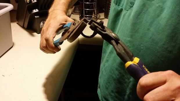 Aquí es donde usted pinzas. Vas a doblar las puntas en sobre un ángulo de 40 a 45 grados. Esta curva es la que permite el utensilio de cocina colgar en un ángulo. Use un par de alicates para sostener la placa de montaje y el otro a la punta de la curva. No importa qué lado curva hacia que todos los ganchos están doblados para el mismo lado.