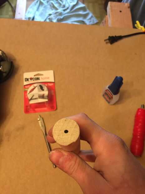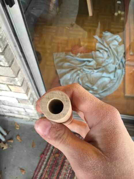 He utilizado una pala de 1/2" broca para esto por lo que sería un ajuste extremadamente cómodo para mi tornillo. Perforé hacia abajo unos 2". Como se puede ver su no exactamente centrado pero eso está bien, es un mango no un motor de jet.