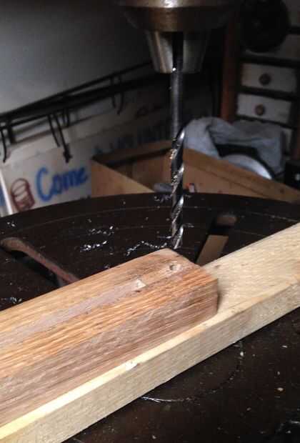 En el extremo de la Asamblea de madera donde la pieza de 4 pulgadas fue pegada entre la piezas una medida más grande del extremo 1/2 pulgada y perfore un orificio a través del conjunto de madera de 3/16 pulgadas de diámetro.