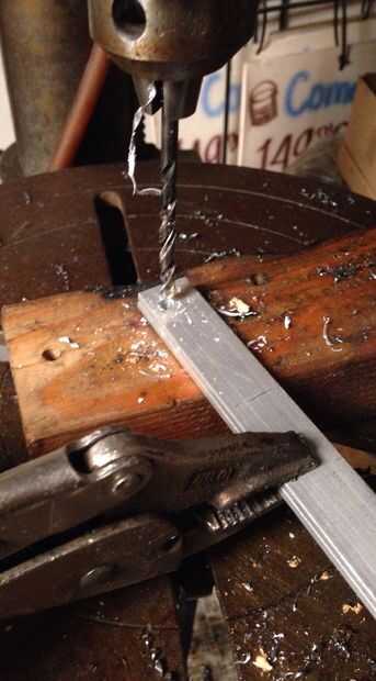 Ver la segunda foto. Sujeta cada par de piezas junto con un tornillo de banco alicates y perforado de agujeros en ambas piezas al mismo tiempo asegurar agujeros espaciados exactamente en cada par de piezas de aluminio. Cada conjunto de agujeros puede ser un poco a un lado de la ubicación exacta que quería, pero cada juego de orificios de perforación al mismo tiempo mantiene la separación entre ellos en cada par de piezas de aluminio de la misma.