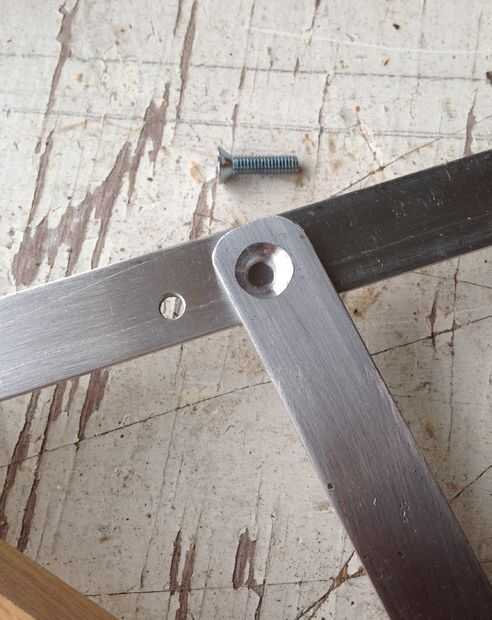 Otro avellanado del taladro, pero que en la pieza más corta de la barra de aluminio que se deslizará directamente sobre el conjunto de madera. Añadir un bisel cabeza 10-32 tornillo y una tuerca de nylon. Aprieta, pero no demasiado apretado.