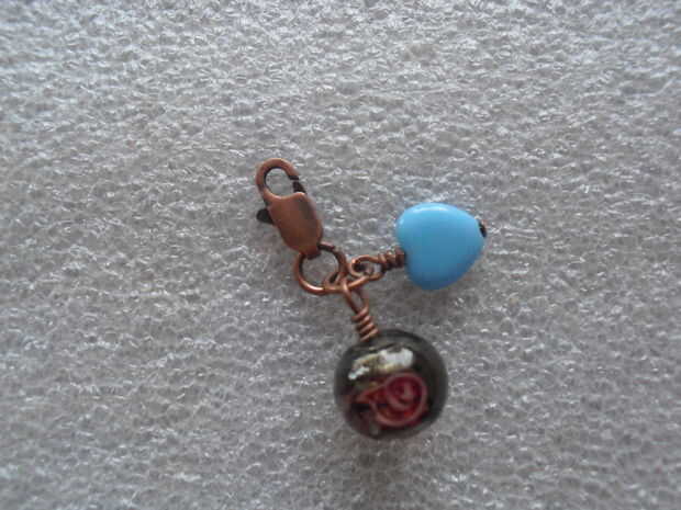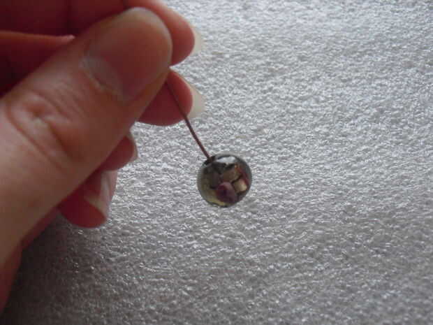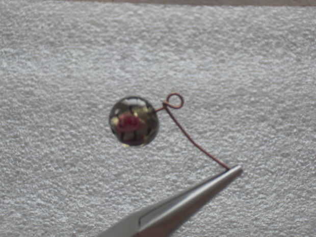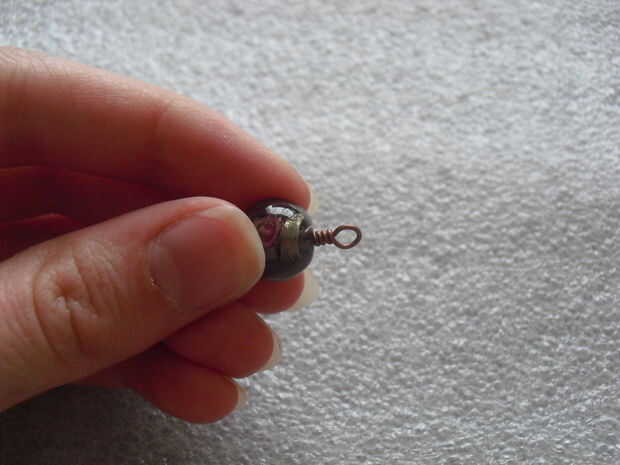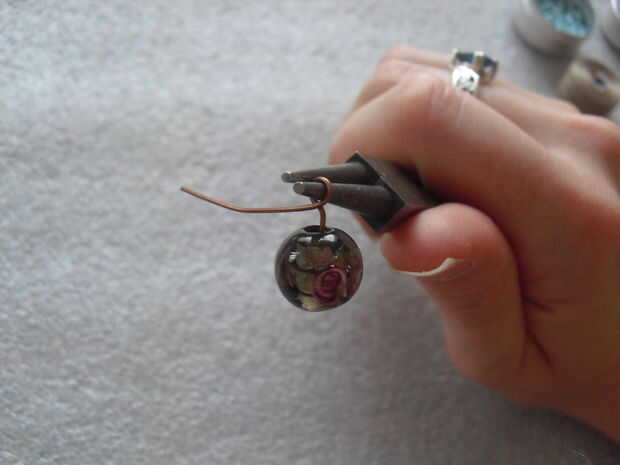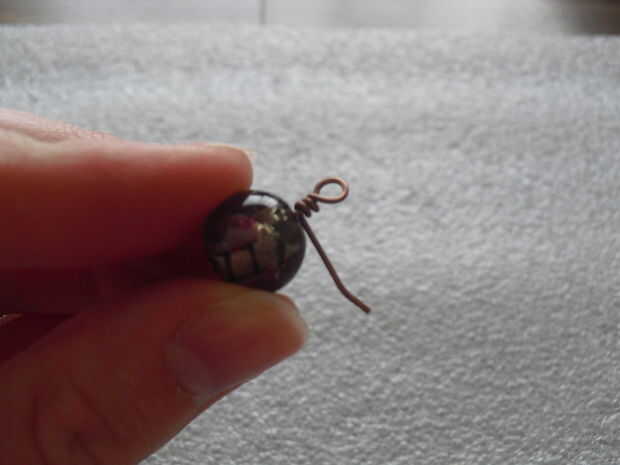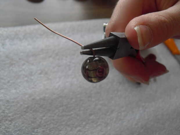 En primer lugar, pase un headpin por el orificio de la perla. Con sus alicates de punta redonda, agarre el pin justo encima del talón y empuje el perno de nuevo a un ángulo de 90 grados (esto permite espacio para el embalaje). Subir tus pinzas ahora a la curva y agarre el derecho lado doblado en ángulo (imagen 2). Tire del alambre doblado para arriba y sobre las pinzas para hacer un bucle y seguir adelante hasta que el cable va hacia atrás en la dirección que empezaste (imagen 3). Manteniendo sus alicates de punta redonda en el agujero que el robusto grano y el lazo redondo, agarre el extremo del cable y tirar para formar una espiral alrededor del perno en el bucle (imágenes 4 y 5). Clip de cualquier exceso de alambre y meta en (imagen 6). Ahora puede añadir su cuelgan para el componente de cierre con anillas (imagen 7). Dejar a un lado para más tarde.