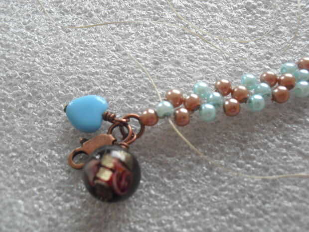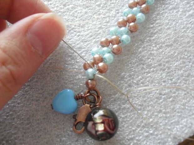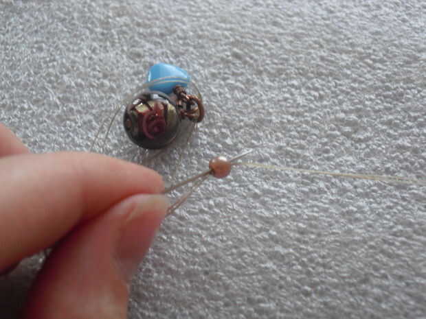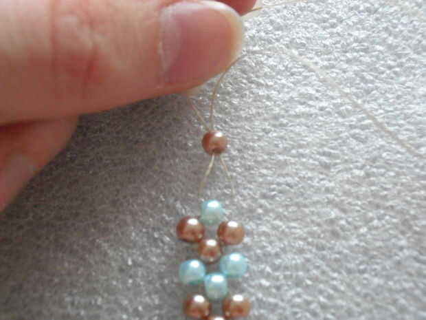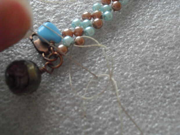 Para terminar, rosca ambos A y B a través de un cordón marrón y tire firmemente contra su última unidad de círculo. Luego pase ambos hilos a través de la jumpring cierre un par de veces y volver por el grano de café. Pasar cada hilo por la última perla azul, pero volver a direcciones opuestas y un nudo en cada lado. Tirar de los hilos a través de las siguiente cuentas de lado para ocultar los nudos (y pegamento si se desea). Usted puede volver a través de la costura tantas veces como desee, agregando tantos nudos como tu quieras, pero sólo asegúrate de esconderlos en el camino. Por último, recorte los extremos.
