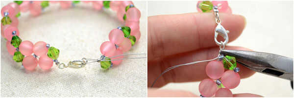 1 º coge la restantes extremos de los cables, del grano prensado una diapositiva, luego a través de la jumpring coincidente en corchete. Finalmente, pasa a través de grano de la encrespadura. Apretar el cable y apriete el grano de la encrespadura con pinzas;
