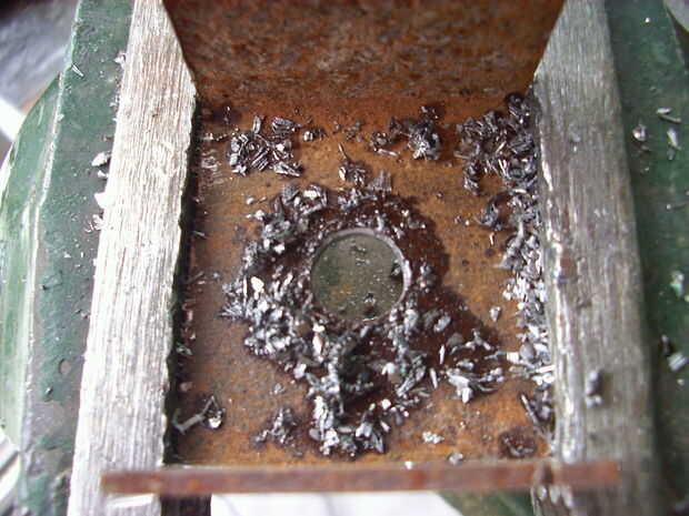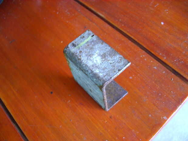 Como desperdicia una base para la herramienta de que utiliza otro pedazo hierro, en forma de U cuadrada. Hice un agujero de 12mm en lo que sería la placa de apoyo, para que primero hice un orificio piloto de 5mm. Luego hice otro agujero de 12mm en el lado lateral, soldar una tuerca a la parte interior de la U, la tuerca previamente colocados y apretados en su lugar.