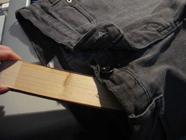 Primer lugar el bloque de madera en los jeans como soporte para su angustia con la hoja de afeitar.