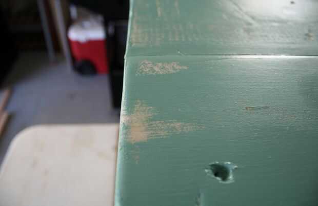 Una vez que esa primera capa esté completamente seca, puede Agregar la segunda capa con otro color. Esta será su "principal" color para el pedazo de muebles que está trabajando. Circulan por las zonas blancas que apenas pintado y llenar los lugares donde hay madera todavía sin demostrar. Quiere dejar a algunos de los blancos expuestos, por lo que muestra a través de como si la capa superior ha pasado a través de los años. Abajo está un primer plano de uno de los rincones que ha sido martillado, después cubierto con la segunda capa de pintura pero que permite un poco de blanco debajo para mostrar a través de.