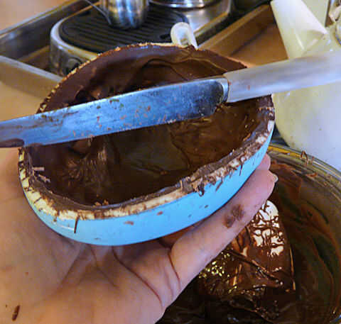 Eliminar las formas del congelador y raspar el chocolate los bordes. Voltee las formas y pop el huevo de chocolate fuera apalancando suavemente los bordes de las formas exteriores. Que tenga que insertar la punta de un cuchillo alrededor del borde entre la forma y el chocolate para el chocolate.