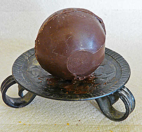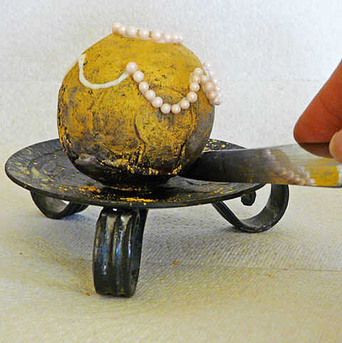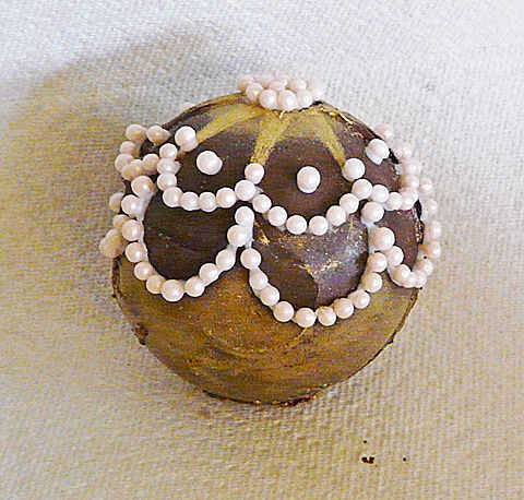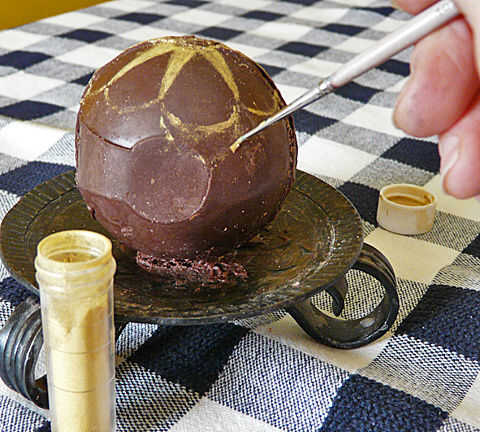 Pintar el huevo con polvo de brillo comestible. Mina había pintado en con un cepillo, pero también se puede untar en con el dedo.