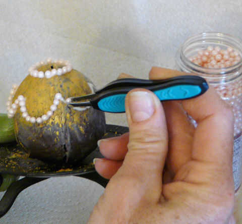Hacer un diseño en el huevo con el tubo de escritor de glaseado y presiona bolas decorativas (comestibles, claro) en la guinda.