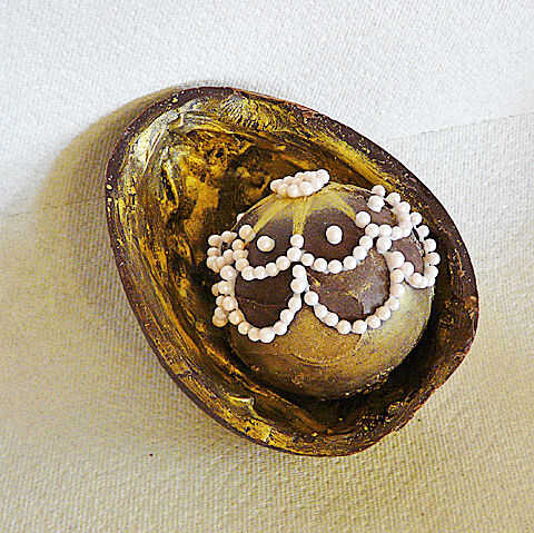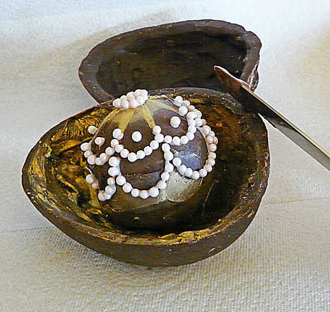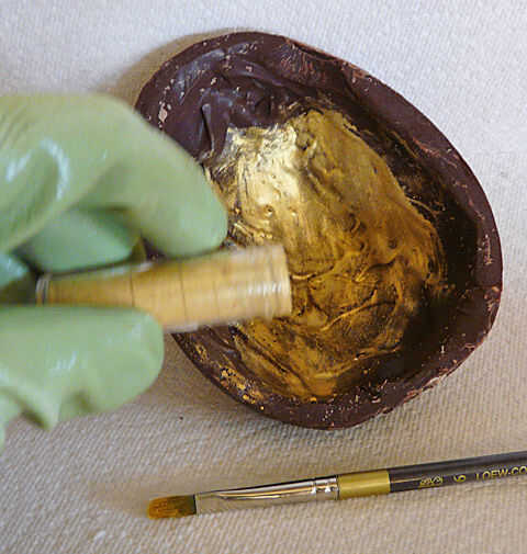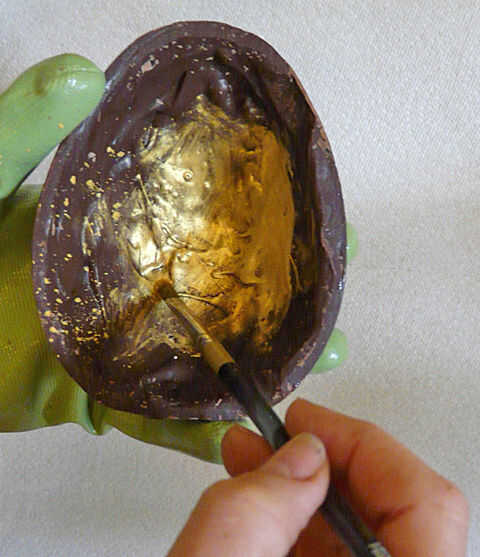 Extensión blanda chocolate alrededor del borde del huevo externo y presione ambos lados juntos.
