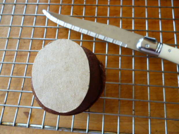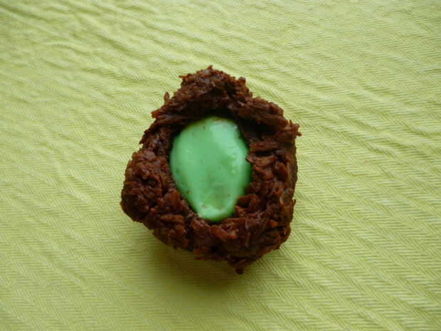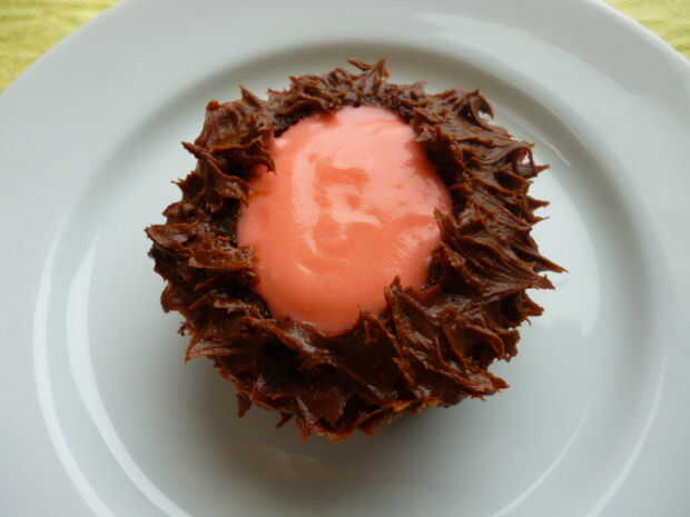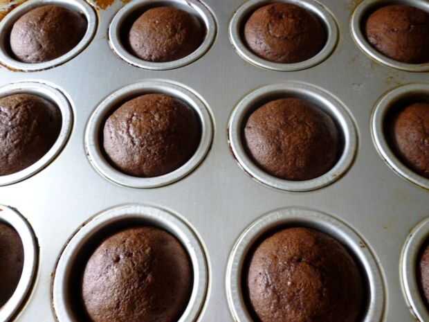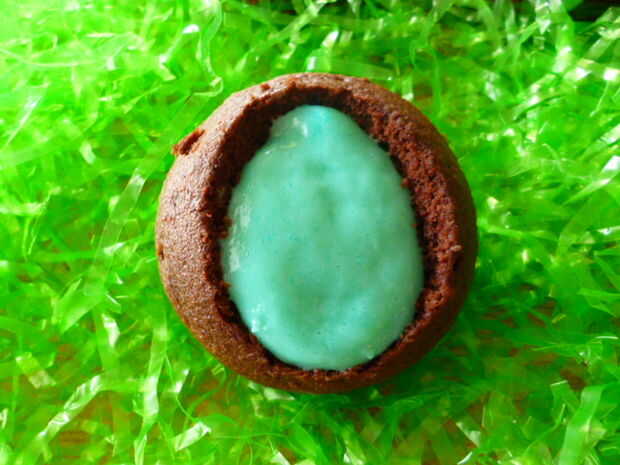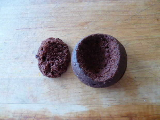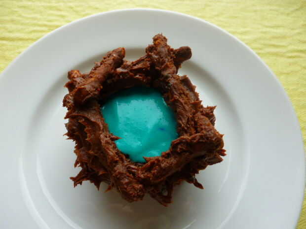 Siga las instrucciones del envase para hornear y cupcakes con una 1/3 taza de enfriamiento-bollitos con su mezcla favorita super húmedo bizcocho de chocolate de tamaño. Mientras tanto, cortar una plantilla en forma de huevo de cartón más corta que el borde de la lata de la Magdalena. Sólo trazó un pequeño huevo en un pedazo de cartón y recórtalo. Coloque la plantilla de huevo encima de un cupcake refrescado y usando un cuchillo afilado hacer un trazo muy superficial de la forma entonces pode los centros dejando una depresión de 1/4 pulgada. Reservamos las migas para otro uso.