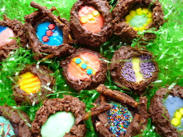 Siga las instrucciones del paquete de Pudin de vainilla y dividir igualmente en tantos cuencos más pequeños como quieras colores. Añadir como mucho colorante a cada recipiente para crear el color que prefiera. Vierta el relleno en el hueco del nido y sacuda suavemente a nivel. Refrigere hasta que cuaje. Decora con los dulces y servir dentro de una hora para evitar que el caramelo derritiendo en el pudín.