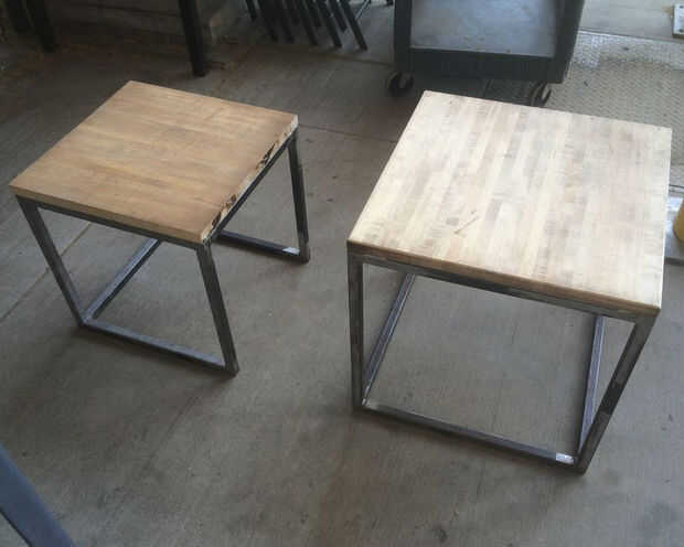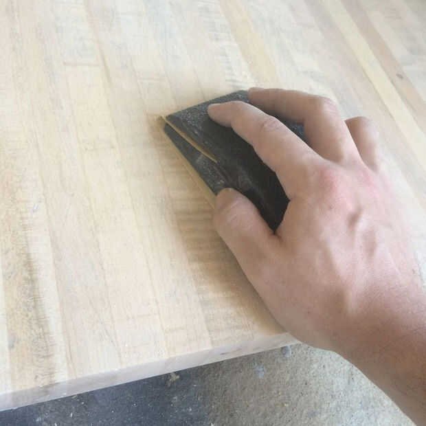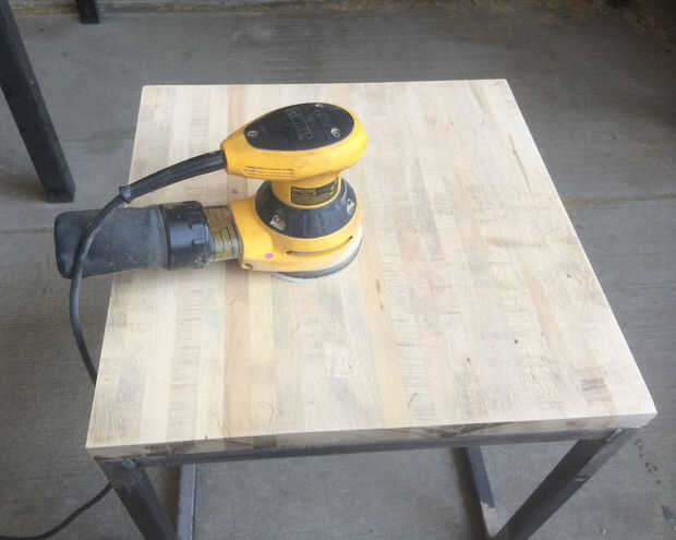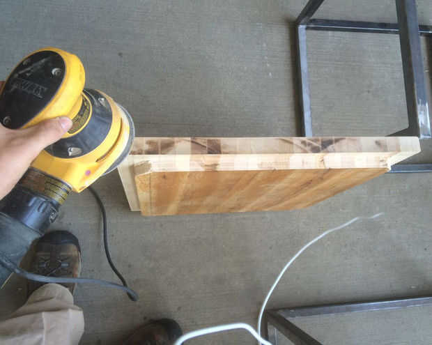 Utilicé una lijadora de Palma y repasado desde grano 80 220. Luego pasó a lijado a mano y me fui hasta 400 grit. Tuvo que trabajar los lados de las tapas de tabla un poco extras para eliminar las marcas de quemadura de cortarlos.