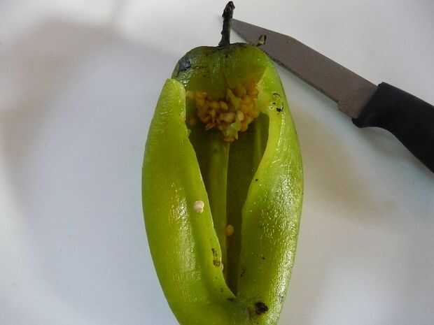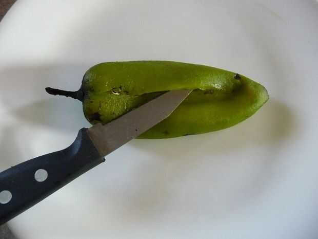 Justo debajo del tallo, cortar una T en un lado de la chile como muestra la imagen. Utilice su imagen en miniatura o una cuchara de pomelo para llegar dentro y raspe/cucharada de las semillas. Suavemente tire/cáscara hacia fuera de la membrana en exceso de las costillas internas, demasiado.