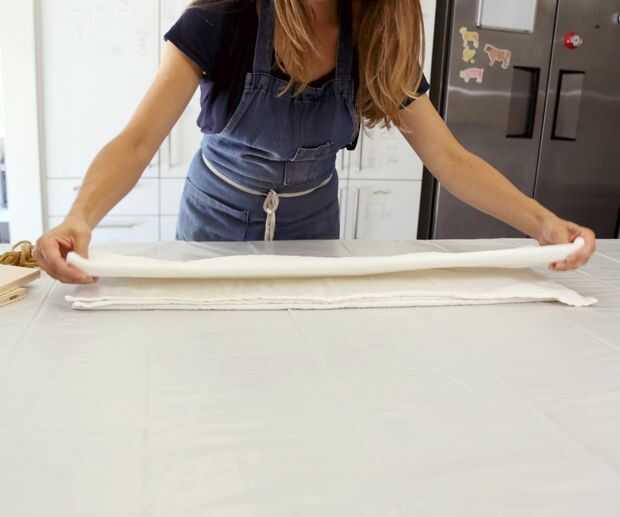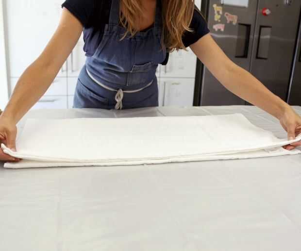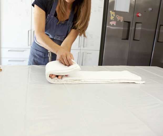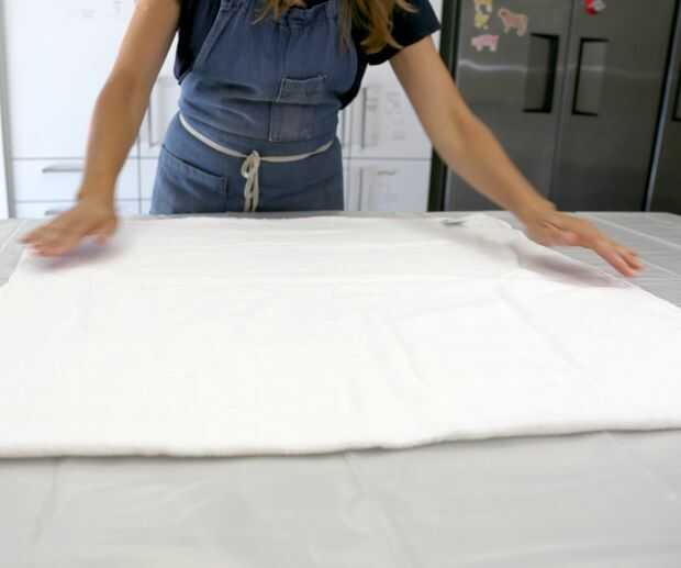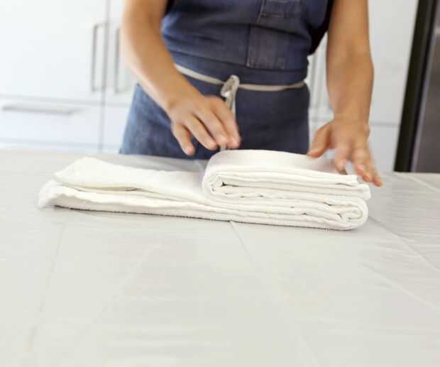 Para la toalla más pequeña, más delgada, que quería un patrón linear para verduras (ver segunda imagen de arriba) y logrado doblando la toalla a lo largo tres veces (1/2, 1/4, entonces 1/8) y luego tres veces el ancho. (como en la foto arriba). El resultado final es un poco ordenado de toalla.