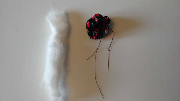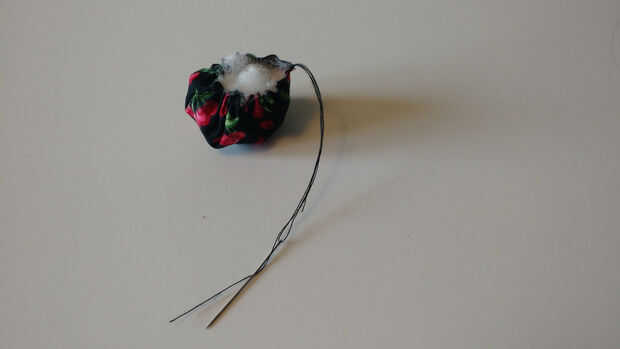 Ceñir el círculo casi cerrado, dejando suficiente de una abertura para llenar la pequeña "bolsa" que has creado con el relleno. Una vez has rellena el cojín, cincha cerrado y atar el hilo.