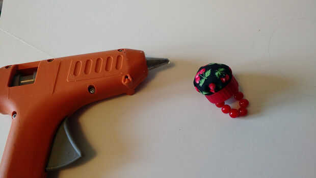Usando la pistola de pegamento caliente, apriete el pegamento en la tapa que cubre el nudo hecho en el interior. Coloque el extremo cosido del cojín en el interior de la tapa.