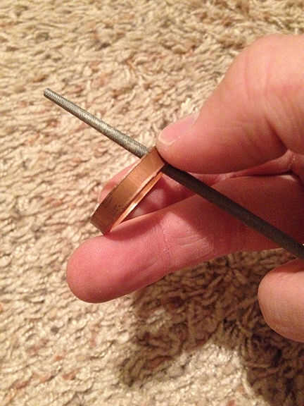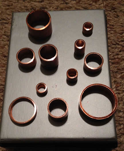 Comenzaremos por tubos de diferente diámetro de corte en una gran variedad de anillos. El funcionamiento de un cortador de pipa es muy fácil. Iniciar con la apertura de la cuchilla sólo lo suficientemente grande como para que el tubo que se corte. Introduce el tubo, a la altura de corte que desee y cierre el cortador de tubos, de manera que apenas empieza a morder el tubo. Girar el tubo o la herramienta de corte, cualquiera que sea más fácil para usted, un par de veces, para crear un buen corte en la tubería. Cierre la herramienta de corte un poco más y girar un par de veces más. Repita hasta que el tubo se corta completamente a través. Corte algunos anillos de diferentes diámetros y crear una variedad de alturas para añadir fondo a usted ornamento. Para este tutorial, no limpian los bordes del anillo. Pero se puede utilizar un metal, algunos lija o, para eliminar cualquier fresas no deseadas y los bordes cortantes.