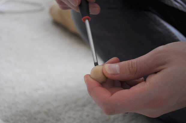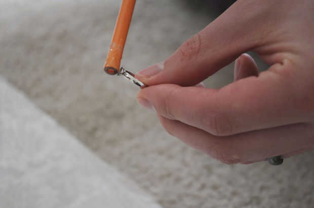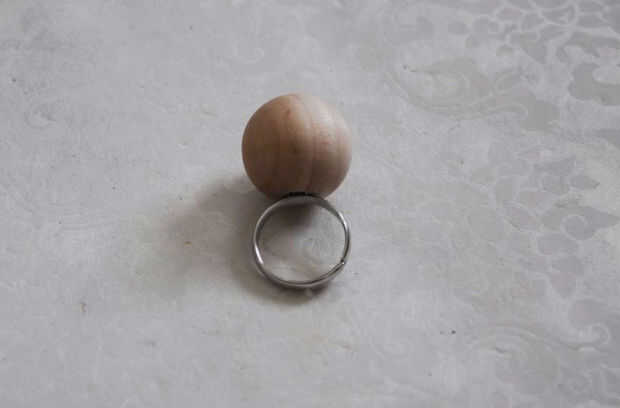 Tu epoxy de 5 minutos de preparación por mezclando las dos soluciones en una pasta. Se aplica a uno de los agujeros en la madera del grano e Inserte la almohadilla del anillo en el orificio (puede que tenga que agrandar el agujero con un destornillador o taladro si la almohadilla del anillo es demasiado grande).
