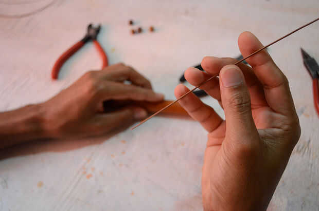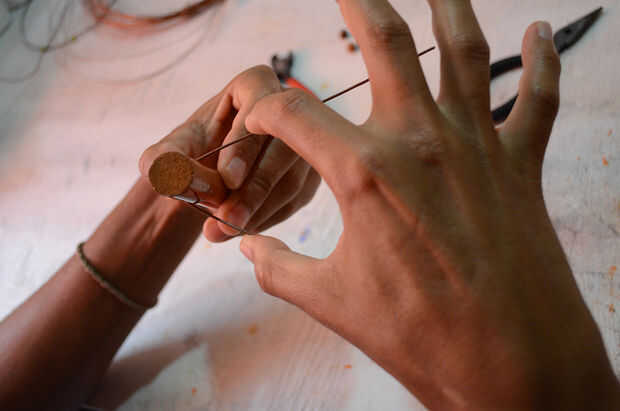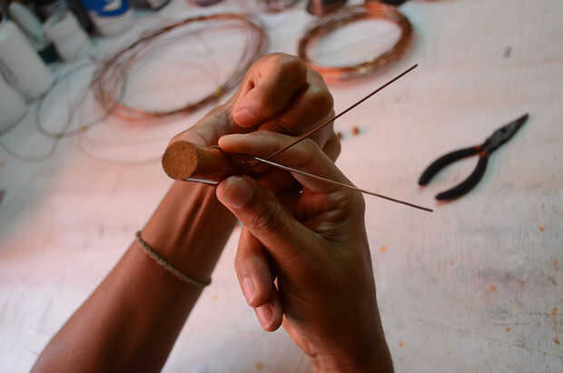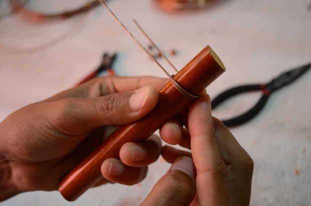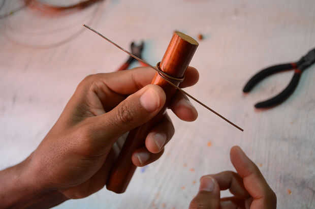 Use el cilindro de ondular el alambre de cobre n º 18, desde su centro. Hacerlo dos veces, por el anillo para convertirse en la más cómoda al usar. Al final, utilizar los alicates diagonales para ajustar las dos terminaciones; deben ser del mismo tamaño (aproximadamente 2" cada uno).