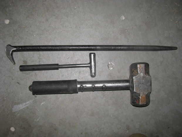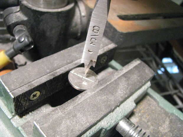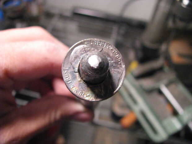 El anillo de la abrazadera. Perforar el centro mayor. Progresivamente puede perforar un agujero más grande hasta que ajusta en el mandril de su uso. O, usted puede apenas utilice una broca de 3/8 como lo hizo. Usé una barra de palanca como el mandril.