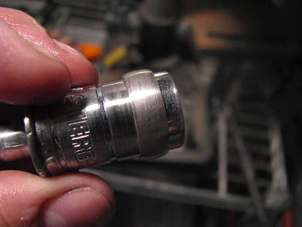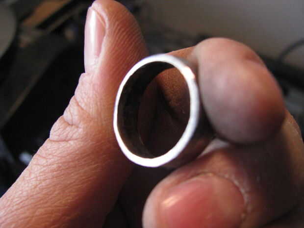 Tenga cuidado de no mar el anillo. Utilice la abrazadera de madera para quitar el anillo de la toma. Voltee el anillo y presione nuevamente en el zócalo. Asegúrese de que utilizar una superficie de trabajo suave cuando usted martilla el anillo encendido y apagado. Usé la pinza lo mismo.