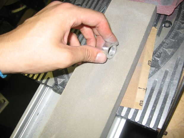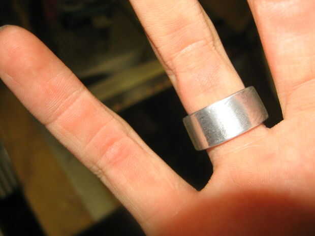 El paso final en la fabricación de los anillos era utilizar un bloque de lija esponja-estilo con una ponencia de cuadrícula mediana para pulir los bordes. El proceso de presentación deja indentaciones únicas en el anillo que encontré atractivo, así que solamente lijar ligeramente para que sea suave. Arena al exterior y el interior (tenga cuidado de no a la arena demasiado desde el interior o bien quizás no encajan correctamente ya). Después completado el lijado, I lavar los anillos con agua y jabón, lo secó y puso en mi dedo.