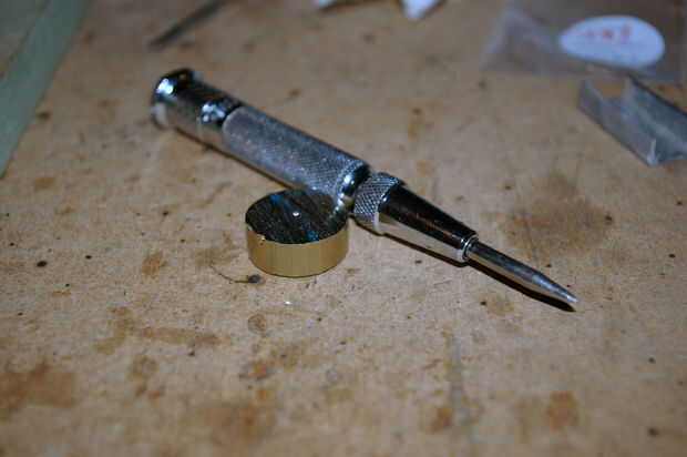 Con un par de pinzas, Escriba una línea alrededor de la circunferencia del espacio en blanco, formando un círculo de 19 mm (3/4") de diámetro. Esto guiará a la eliminación de material desde el centro del latón.